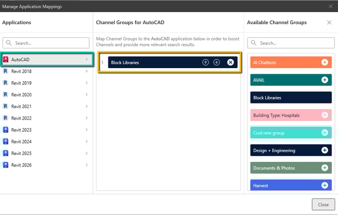 - In the right panel, all available Channel Groups will appear. Click the Plus (+) button next to the Channel Group you want to map to AutoCAD.